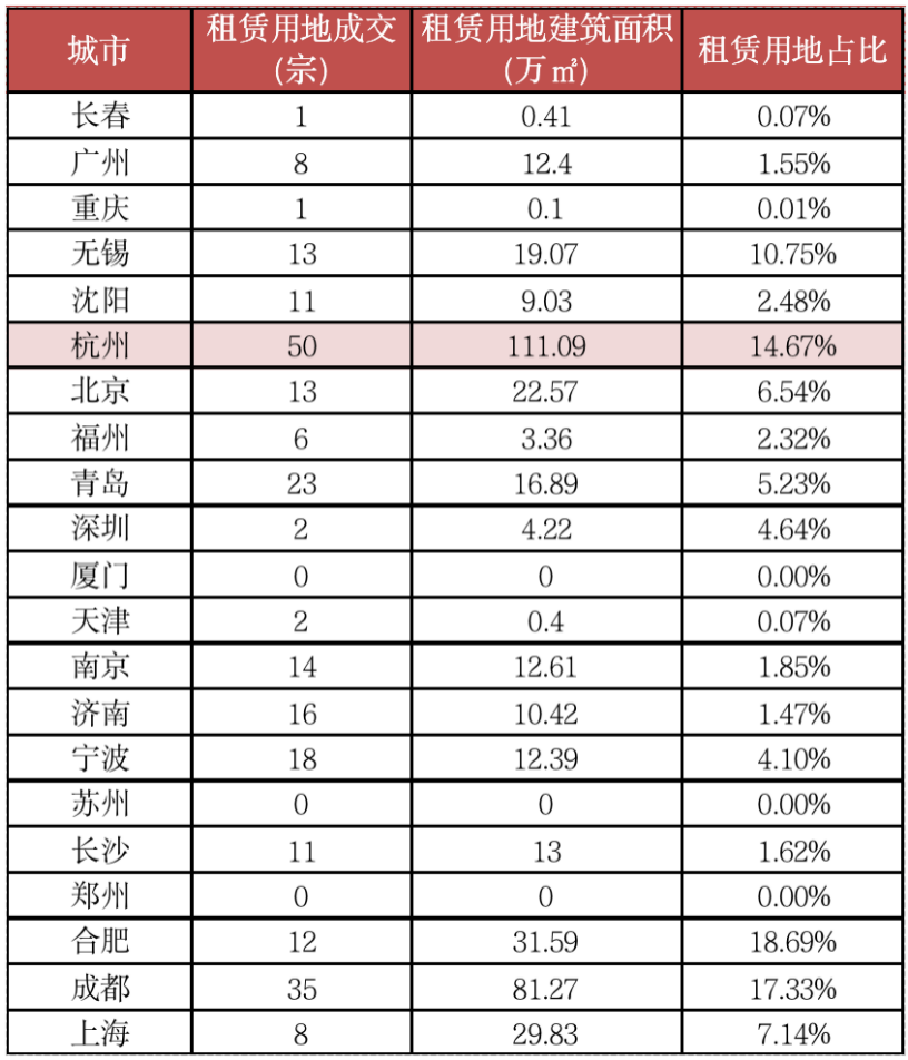 從首批租賃用地成交情況來看,杭州競自持用地高達41宗,占比超七成,其中已成交涉租賃用地成交宗數(shù)達50宗,占成交地塊88%;成交建面111.09萬平方米,高居22城榜首,租賃用地占比已達14.67%。成都已成交涉租賃用地也達到了35宗,租賃用地面積達到81.27萬平方米,占比達17.33%;合肥這一比例更高,租賃用地面積占已成交地塊面積達到18.69%。此外,廈門成交土地共5宗,所有地塊均需部分自持。