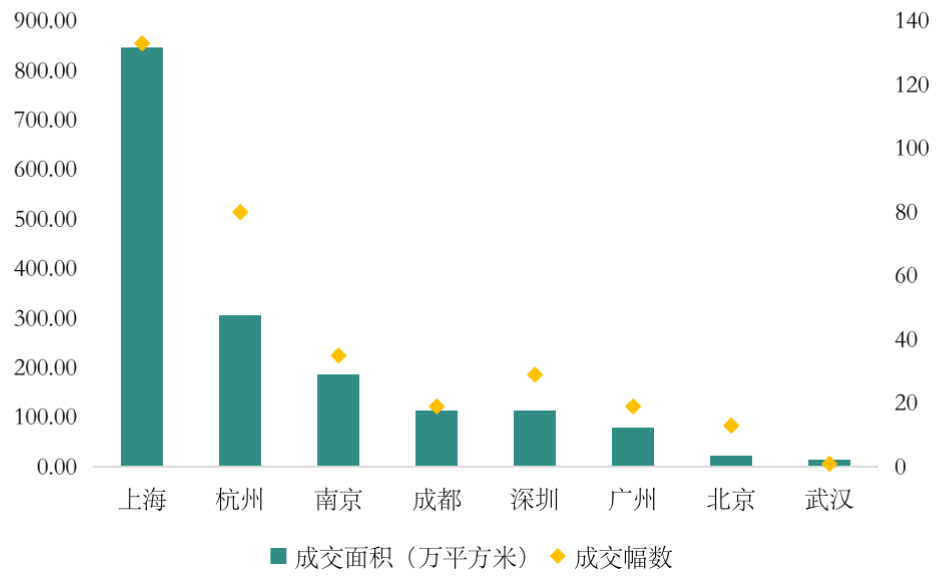 從數(shù)據可以看出,上海租賃用地無論是累計成交面積還是成交幅數(shù)都排全國首位,并遙遙領先于第二、第三位的杭州和南京。