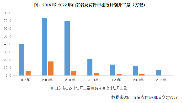 長期以來,菏澤乃是山東省棚改第一大市,2017年棚改計劃開工量高達18.2萬套,高居全國首位。隨著山東省棚改逐步退出,并由貨幣化安置改為就地還建,菏澤棚改同樣進入收尾階段,2022年棚改計劃開工量低至0.4萬套,棚改對市場的拉動力大幅減弱。
