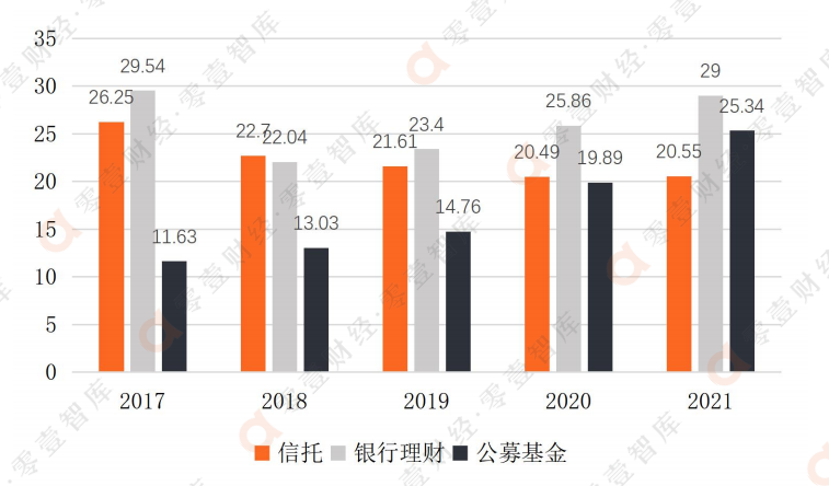 與信托管理規模連續下降,銀行理財規模先降后升相比,公募基金的管理規模此前雖然相對較低,但在2017至2021年的上升趨勢非常平穩,在2021年更是一舉突破了20萬億元大關,完成對信托的反超。