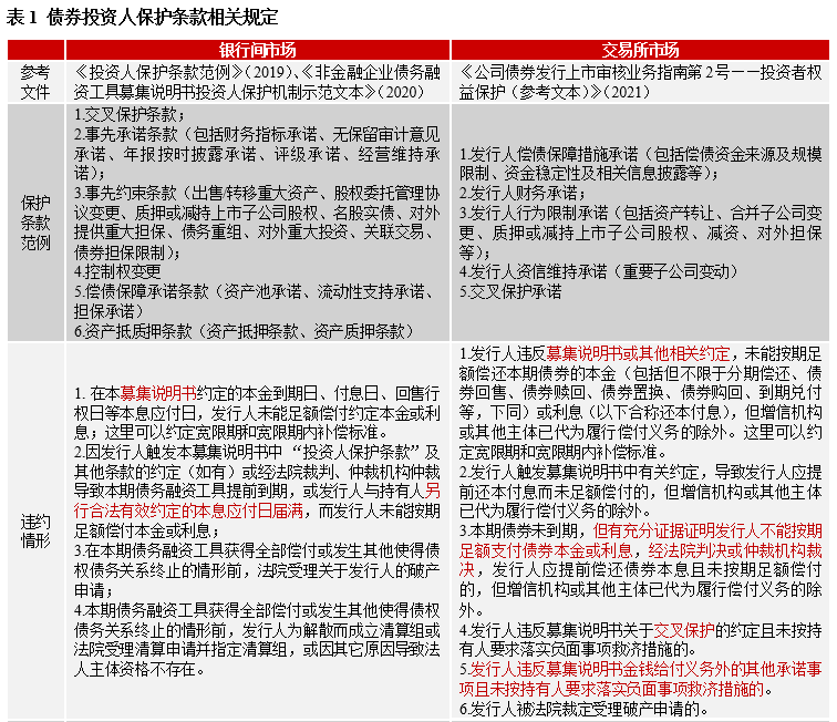 從2022年違約地產(chǎn)債券后續(xù)處置看,保護性條款對企業(yè)償付壓力和債券兌付的影響較為明顯。投資人保護性條款是為保護投資人相關(guān)權(quán)益而在發(fā)行文件中明確做出相關(guān)約定,為債券糾紛提供處置依據(jù)。在我國,2016年9月,銀行間市場首先推出《投資人保護條款范例》(簡稱《范例》),并在2019年進行修訂,新設事先承諾條款、償債保障承諾條款、資產(chǎn)抵質(zhì)押條款,將事先約束條款中部分指標進行重新分配,增加多項參考性細分條款。2020年10月,交易商協(xié)會又發(fā)布《非金融企業(yè)債務融資工具募集說明書投資人保護機制示范文本》,進一步完善保護條款應用機制。2017年6月,交易所市場由中證協(xié)發(fā)布《公司債券投資者保護條款范例(征求意見稿)》,后續(xù)并未出臺正式稿。2021年8月,滬深交易所發(fā)布《公司債券發(fā)行上市審核業(yè)務指南第2號——投資者權(quán)益保護(參考文本)》(簡稱《參考文本》),進而彌補了交易所市場在此領(lǐng)域的政策空白。從違約觸發(fā)事件的參考定義看,二者都包括未能履行既有約定的償付義務,因償債能力不足導致進入破產(chǎn)相關(guān)程序,以及主張預期違約下經(jīng)法院或仲裁機構(gòu)判決提前到期而未足額償付的情形。此外,交易所還包括“未按持有人要求落實負面事項救濟措施的”的情形,進一步擴大了違約范圍,同時強化保護性條款救濟措施的約束力。