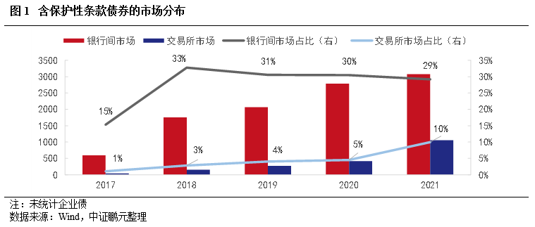 第一,保護性條款應用比例和條款類型大幅提升。通過對已發(fā)行債券特殊條款的粗略統(tǒng)計,含持有人保護性條款[1]的債券占比從2017年8.4%上升至2021年的21.8%。在投資人保護性條款推出初期,交叉保護和事先承諾為主要類型,其次是控制權(quán)變更。隨著2019年交易商協(xié)會對《范例》進行修訂,債券保護性條款應用大幅提升,其中“交叉保護”、“財務指標承諾”、“出售/轉(zhuǎn)移重大資產(chǎn)”和“控制權(quán)變更”是使用較為廣泛的條款。從2021年情況看,設置“經(jīng)營維持承諾”和“償債保障承諾”的債券明顯增加。第二,不同保護性條款可以疊加使用。從2021年發(fā)行數(shù)據(jù)看,設置2個條款的信用債占比7.4%,以“交叉保護和出售/轉(zhuǎn)移重大資產(chǎn)”的組合為主,設置2個以上的債券占比10.4%,以“交叉保護、財務指標承諾和出售/轉(zhuǎn)移重大資產(chǎn)”的組合為主。第三,從市場分布看,含保護性條款的債券主要分布在銀行間市場,但隨著交易所制度的完善,其債券應用比例有明顯上升,2021年為25%。其中,交易所市場中含保護性條款的債券在該市場的占比近年呈現(xiàn)增長,2021年為10%;銀行間市場中含保護性條款的債券在該市場的占比近年出現(xiàn)微幅下降,2021年為29%。