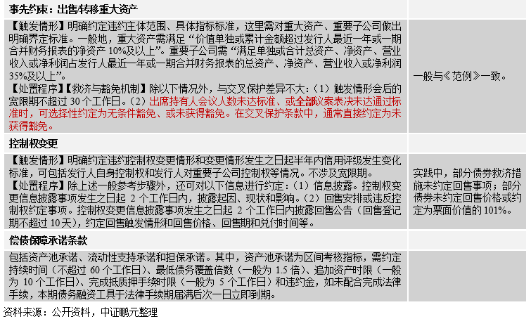 交叉保護相對于其他條款對發(fā)行人的約束力更強,主要體現(xiàn)在,第一,和一般債券的違約情形相比,相當于擴大了違約債務的覆蓋范圍。第二,救濟措施給予的寬限期上限短于其他條款,且與約定債務的寬限期有關(guān)。另外,交叉保護條款一般約定寬限期內(nèi)完成觸發(fā)情形中債務的足額償還,則不作為實質(zhì)性交叉違約。通常發(fā)行人此時償還能力極為有限,其能做的最好的情況是對觸發(fā)情形中債務進行展期,從既有案例看,展期將不會觸發(fā)其他債券的交叉保護條款。第三,決議表決生效條件更嚴格。交叉保護、事先約束和事先承諾均涉及召開持有人會議商議豁免議案,但后兩者在出席持有人會議人數(shù)未達標準、或表決全部議案未達通過標準時,可選擇性約定為無條件豁免、或未獲得豁免。在交叉保護條款中,通常直接約定為未獲得豁免。此外,與其他條款不同,償債保障承諾條款更傾向于發(fā)行人在約定期內(nèi)做出糾正和行為履行,與債務償還能力直接相關(guān)。在資產(chǎn)池承諾項下,如未及時作出糾正,債務無需經(jīng)持有人會議直接提前到期,而違反流動性支持和擔保承諾不會導致債務到期,僅涉及違約金支付。從這個角度看,資產(chǎn)池承諾成為交叉保護條款后的另一大約束性條款。