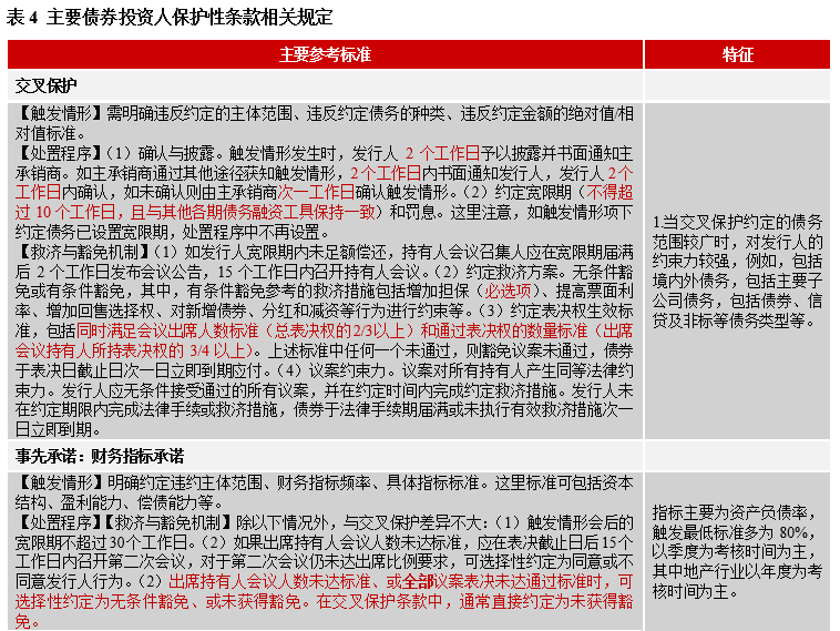 保護性條款的特征:(1)特征:第一,不同條款的保護力度有所差異,其中交叉保護相對于其他條款對發(fā)行人的約束力更強,資產(chǎn)池承諾成為交叉保護條款后的另一大約束性條款。第二,保護性條款,將差異化持有人會議及議案的生效條件。通常,銀行間品種對保護性條款的決議生效做單獨約定。第三,非標準化的保護性條款或加強投資者保護。部分債券雖未約定特殊保護性條款,但在違約情形中做出相關(guān)約定。這里需要注意,違約情形和保護性條款中約定的觸發(fā)情形、違約處置和救濟措施的差異。(2)保護性條款應用中存在的問題。第一,部分債券對保護性條款等的約定不夠清晰。第二,持有人會議議事效率不高。第三,多次觸發(fā)保護性條款,反復召開持有人會議。第四,債券提前到期的時間存在不確定性。