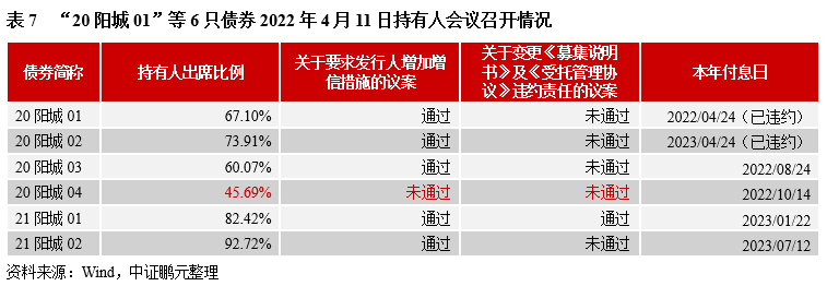 受企業(yè)償債風險顯露影響,不包含保護性條款的債券觸發(fā)持有人會議召開條件。例如,2022年4月11日,“20陽城01”、“20陽城02”、“20陽城03”、“20陽城04”、“21陽城01”、“21陽城01”、“21陽城02”由債券受托管理人作為會議召集人召開持有人會議,審議的議案中包括增加增信措施,變更《募集說明書》及《受托管理協(xié)議》違約責任等。截至表決日中,僅“21陽城01”通過變更違約責任的議案,為此,其他債券均觸發(fā)約定的違約情形,其中,“20陽城04”因未達出席比例,根據(jù)約定該次持有人會議無效。