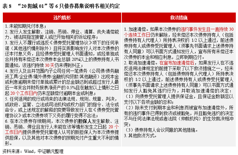 部分債券雖未約定特殊保護性條款,但在違約情形中做出相關(guān)約定。一般來說,違約事件通常包括拖欠付款、解散、破產(chǎn)三種類型,部分債券包含了更多情形。例如,“主體級別低于AA”、“其他債務違約時視為發(fā)行人觸發(fā)違約情形”、“發(fā)生其他對本次債券兌付產(chǎn)生重大不利影響的情形”。上述約定和保護性條款中“評級承諾”“交叉保護”等類似,但對發(fā)行人的約束力高于保護性條款,一般會約定寬限期。這里需要注意,違約情形和保護性條款中約定的觸發(fā)情形有一定的區(qū)別,前者定義的風險類型較高,可以認為是絕對違約風險,更接近于法律上的違約事實,而后者更多的是建立行為約束。所以,將部分條款直接定義為違約情形,雖然將提高投資者保護,但同時加強企業(yè)行為約束,容易造成融資空間的波動。部分債券的違約情形中包括更多主觀性定義,例如,“發(fā)生其他對本次債券兌付產(chǎn)生重大不利影響的情形”,不利于判斷違約行為的發(fā)生。本文認為,可將絕對性違約情形列為違約觸發(fā)事件范圍內(nèi),而將行為約束性條款放入保護性條款內(nèi),并盡量用量化指標。