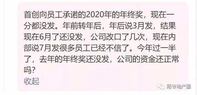 首創(chuàng)置業(yè)原本在2021年春節(jié)前向員工發(fā)放的年終獎至今仍遙遙無期,春節(jié)前推春節(jié)后,3月推6月,現(xiàn)在又說改到7月。