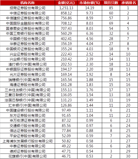 一、全市場ABS總承銷排名