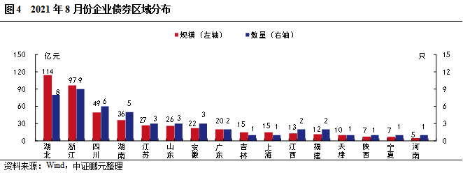 2021年8月,共有16個省份發(fā)行了企業(yè)債券。其中,湖北省和浙江省分別發(fā)行114.30億元和96.50億元,規(guī)模遠高于其他省份,其次,四川省和湖南省分別發(fā)行49.40億元和36.20億元。從發(fā)行數(shù)量上看,浙江省和湖北省分別發(fā)行9只和8只,四川省和湖南省分別發(fā)行6只和5只,其他省份發(fā)行數(shù)量較少。與上年同期相比,8月分,有8個省份發(fā)行規(guī)模較上年同期出現(xiàn)增長,其中,浙江省同比增長311%;有6個省份發(fā)行規(guī)模同比出現(xiàn)下降,其中廣東省下降71%,而云南、重慶、甘肅和河北本月未發(fā)行。