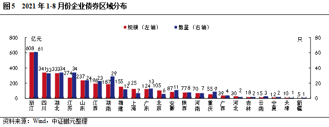 綜合2021年1-8月份看,浙江省發(fā)行規(guī)模最大,累計607.90億元,發(fā)行數(shù)量61只;四川省和湖北省分別發(fā)行340.80億元和333.10億元,位列第二、第三;江蘇省和山東省分別發(fā)行273.80億元、237.10億元,規(guī)模也相對較大。與上年同期相比,有13個省份的企業(yè)債發(fā)行規(guī)模同比增加,其中,浙江省同比增加291.9%,漲幅最大,其次是江西省和四川省分別增長104.10%和96.40%;共有7個省份的企業(yè)債發(fā)行規(guī)模同比下降,其中,云南省和天津省均同比下降77.8%,降幅較大。此外,貴州、山西、甘肅和海南省本年未發(fā)行。