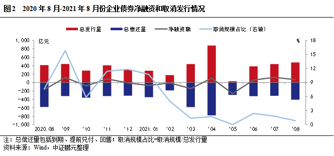 從凈融資情況來看,8月企業(yè)債券總發(fā)行規(guī)模475.10億元,總償還規(guī)模407.94億元,本月表現(xiàn)為凈發(fā)行67.16億元,上年同期為凈償還167.17億元。此外,2021年8月有2只企業(yè)債券取消發(fā)行,原計劃發(fā)行規(guī)模4億元。2021年1-8月份,企業(yè)債凈融資表現(xiàn)為凈償還133.74億元,較上年同期凈償還規(guī)模減少1,164.53億元。