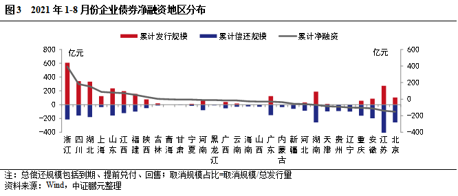 從地區(qū)分布看,2021年1-8月份企業(yè)債凈融資依然呈現(xiàn)兩極分化,多個經(jīng)濟欠發(fā)達地區(qū)本年度尚未發(fā)行企業(yè)債。其中,浙江省實現(xiàn)凈融資392.52億元,遠高于其他省份,其次是四川省和湖北省分別實現(xiàn)凈融資181.62億元和153.20億元,位居第二、第三。此外,上海因償還規(guī)模較小,實現(xiàn)凈融資規(guī)模88.15億元,位居第四。而湖南省、江蘇省和廣東省因償還規(guī)模較大,凈融資規(guī)模為負。青海、甘肅、黑龍江、海南、內(nèi)蒙古、山西、貴州、遼寧未發(fā)行企業(yè)債,其中,貴州和遼寧的償還規(guī)模較大,分別為92.48億元、101.94億元。