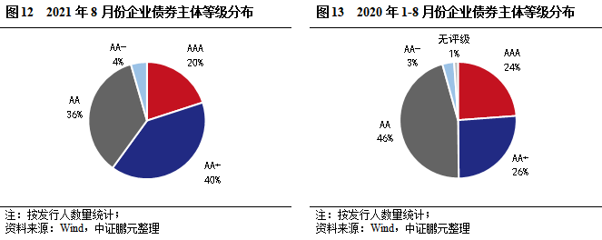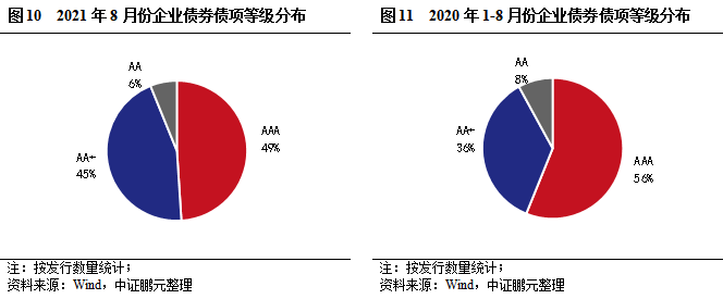 從發(fā)行主體等級看,8月AAA級主體9家,占比20%;AA+級主體18家,占比40%;AA級主體16家,占比36%,AA-級主體2家,占比4%。整體看,8月高等級企業(yè)債發(fā)行人數(shù)量占比60%,較上月下降6個百分點。綜合2021年1-8月看,AAA級主體占比24%,AA+級占比26%,AA+及以上占比較上年同期基本持平。