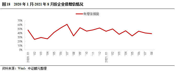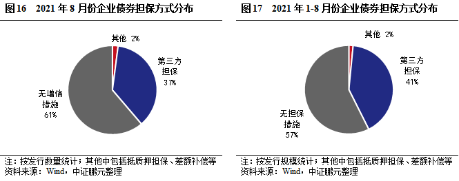 2021年8月,企業(yè)債有擔(dān)保的債券共計19只,數(shù)量占比39%,較上月下降1個百分點。分主體級別看,AA級主體選擇保證方式增信發(fā)行的債券比重為81.3%,較上月下降5.4個百分點;AA+級主體選擇增信發(fā)行的債券比重為15.8%,較上月下降15.5個百分點。綜合2021年1-8月看,有增信的債券占比43%,與上年持平。從趨勢看,2021年6月以來有增信債券占比呈現(xiàn)下降。