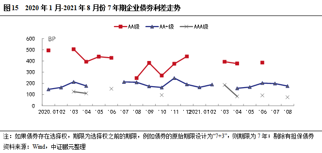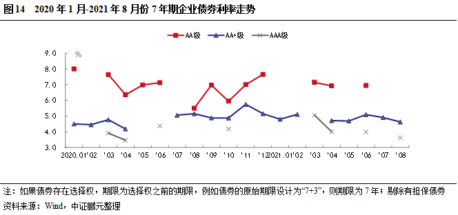 從趨勢看,7年期除權(quán)無擔(dān)保企業(yè)債,8月份AA+級平均發(fā)行利率下行,利差收窄,其他級別上月未發(fā)行。AAA級平均發(fā)行利率和利差較6月有所下行。