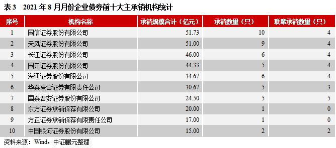就承銷機構(gòu)而言,2021年8月共有29家機構(gòu)參與企業(yè)債券的承銷工作。國信證券和天風(fēng)證券分別承銷51.73億元和51億元,位居第一、第二;長江證券承銷46億元,位居第三;國開證券承銷44.33億元,位居第四。