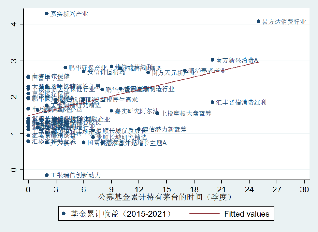 套用索羅斯的名言,不要告訴我你對了,關鍵是你是否拿得住。圖1展示了,公募股票基金持有茅臺的時間和基金的業績的關系。