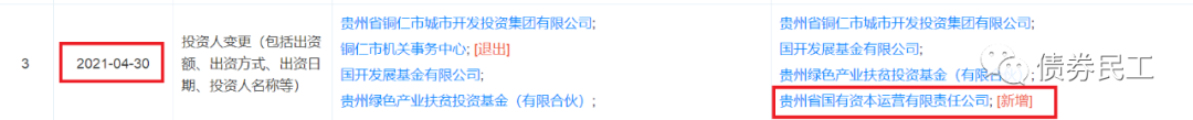 2、2021年4月30日,貴州國資公司成為銅仁市水務投資有限責任公司(中誠信國際和聯合資信主體信用等級AA,實際控制人銅仁市國有資產管理局)持股比例為17.41026%的股東。