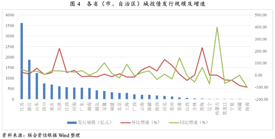 同比方面,三季度共有19個(gè)省(市、自治區(qū))城投債發(fā)行規(guī)模同比增長,在發(fā)行規(guī)模超過200億元的省(市、自治區(qū))中,上海和安徽發(fā)行規(guī)模同比分別增長90.98%和101.96%,增幅明顯;北京和廣西發(fā)行規(guī)模同比分別下降23.93%和6.54%。環(huán)比方面,三季度共有17個(gè)省(市、自治區(qū))城投債發(fā)行規(guī)模環(huán)比增長,在發(fā)行規(guī)模超過200億元的省(市、自治區(qū))中,天津、新疆、山東、云南、河南發(fā)行規(guī)模環(huán)比分別增長223.42%、72.37%、56.05%、46.01%和39.19%,增幅明顯;上海、廣西、湖北、廣東、福建和湖南發(fā)行規(guī)模環(huán)比分別下降15.93%、15.39%、13.47%、11.95%、11.07%和7.53%,降幅明顯。