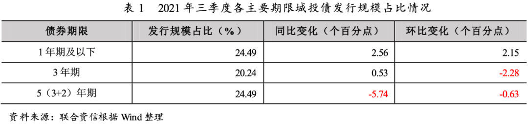 從發(fā)行期限上看,三季度城投債仍以中短期為主,1年期及以下發(fā)行規(guī)模占比同比上升較快,5(3+2)年期發(fā)行規(guī)模占比同比下降幅度較大。