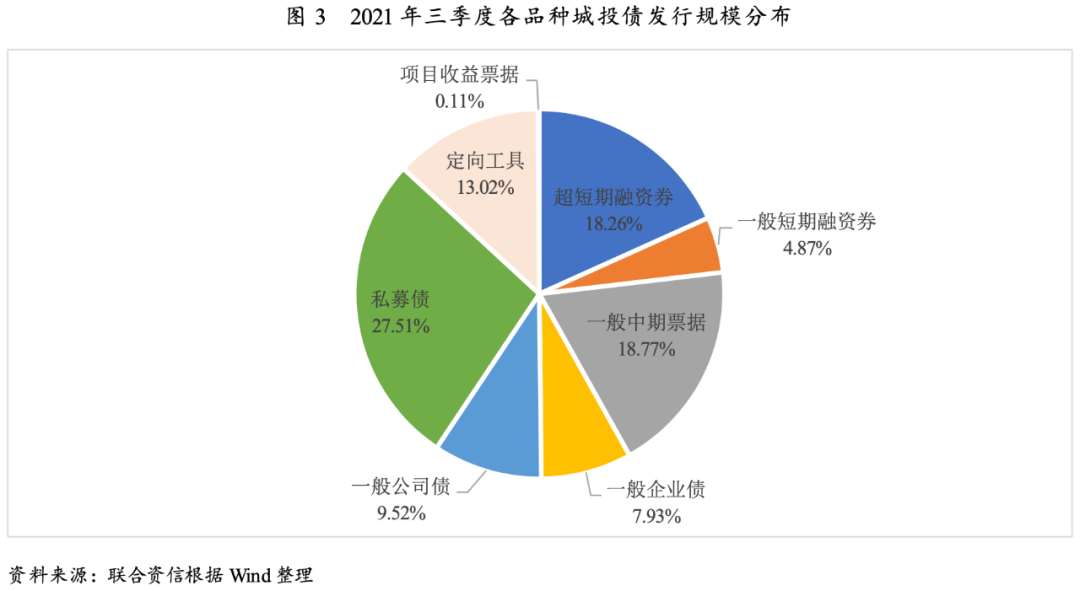 從發(fā)行方式看,三季度公募和私募發(fā)行城投債規(guī)模占比較為均衡;從發(fā)行期限看,城投債發(fā)行期限仍以中短期為主,1年期及以下城投債發(fā)行規(guī)模占比環(huán)比進(jìn)一步上升;從債券品種看,仍以私募公司債為主,除企業(yè)債外其他品種發(fā)行規(guī)模環(huán)比均有所增長。