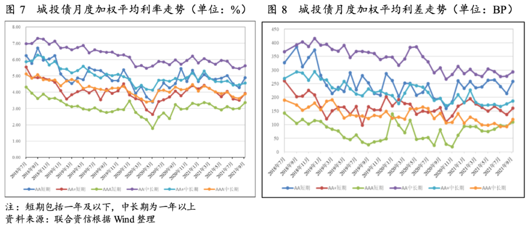 發(fā)行利差方面,2021年三季度,AA級各期限城投債發(fā)行利差環(huán)比均有所下降;AA+級城投債不同期限的發(fā)行利差表現(xiàn)不一,短期城投債發(fā)行利差環(huán)比明顯下降,中長期城投債發(fā)行利差略有上升;AAA級城投債發(fā)行利差環(huán)比均有所走擴(kuò)。同比方面,受“15號文”等監(jiān)管政策對城投企業(yè)短期流動性造成的影響,短期城投債發(fā)行利差同比明顯上升,中長期城投債發(fā)行利差同比均明顯下降。分月來看,7月,AAA級短期城投債平均發(fā)行利差較6月走擴(kuò),其他城投債平均發(fā)行利差環(huán)比均有所收窄;8月,AA級和AA+級中長期城投債的平均發(fā)行利差小幅上升,其他城投債的平均發(fā)行利差持續(xù)下行;9月,城投債的平均發(fā)行利差環(huán)比均有所上升。