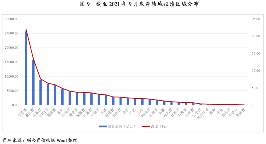 截至三季度末,全國有存續(xù)債券的城投企業(yè)共2916家,存續(xù)債券共15890支,債券余額116667.45億元。從地區(qū)分布看,江蘇省城投債余額為25704.57億元,占全國城投債券余額的22.03%,居于首位;浙江省、山東省、四川省和湖南省分列二至五名,占比分別為13.37%、7.58%、6.33%和5.87%。