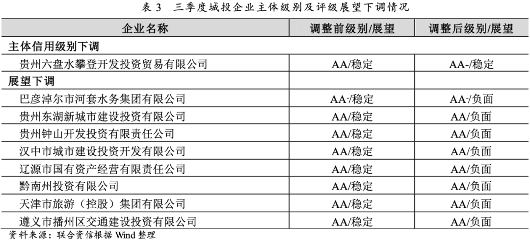 三季度,涉及主體級別或評級展望下調(diào)的城投企業(yè)分布在貴州省、內(nèi)蒙古自治區(qū)、陜西省和天津市,下調(diào)原因主要包括償債壓力大、未及時(shí)償還金融機(jī)構(gòu)債務(wù)、經(jīng)營情況存在較大不確定性以及擔(dān)保代償風(fēng)險(xiǎn)較大等。