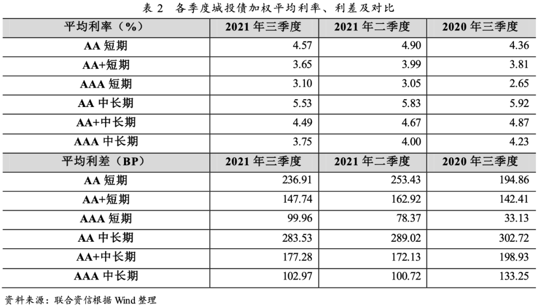 三季度,城投債發(fā)行數(shù)量和發(fā)行規(guī)模分別為2037支和14100.82億元,同比分別增長19.19%和18.27%,環(huán)比分別增長34.63%和25.29%。一方面,2021年下半年城投債迎來一輪到期和行權(quán)高峰,兌付壓力較2020年同期有所上升,市場再融資需求進(jìn)一步擴(kuò)大;另一方面,4月以來國發(fā)〔2021〕5號文、公司債發(fā)行審核條件收緊等監(jiān)管政策密集發(fā)布,二季度城投債發(fā)行規(guī)模環(huán)比降幅明顯,被抑制的發(fā)行需求在三季度得到一定釋放。