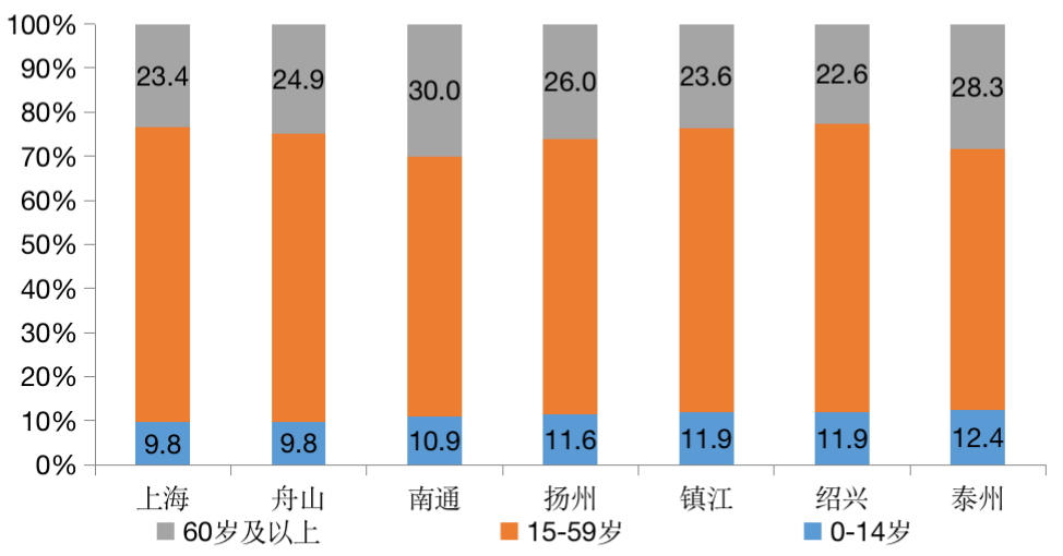 圖:長三角地區典型老齡少子化城市各年齡段人口占比(%)