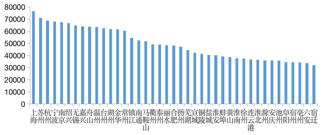 其中,上海、蘇州兩城2020年城鎮居民人均可支配收入更是超7萬元/人,上海城鎮居民可支配收入高達76437元/人,居全國之首;其次,杭州、寧波、南京、紹興、無錫、嘉興、舟山、溫州、臺州、湖州、金華、常州等城市城鎮居民人均可支配收入均超6萬元/人,在全國也居于前列。