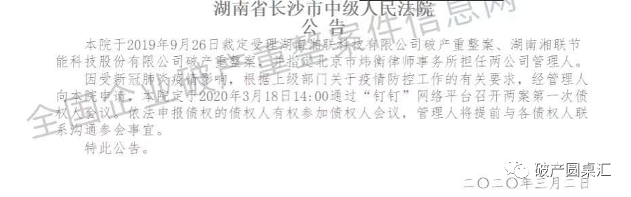 2019年11月,我們團(tuán)隊被長沙市中級人民法院指定為湖南湘聯(lián)節(jié)能科技股份有限公司、湖南湘聯(lián)科技有限公司協(xié)同重整案的破產(chǎn)管理人。受新冠肺炎疫情影響,債權(quán)人復(fù)工時間不一或多居家避疫,為最大限度減少人員流動和聚集,同時推進(jìn)拯救企業(yè),長沙中院堅持疫情防控和拯救企業(yè)兩手抓、兩手硬,并于3月初決定以網(wǎng)絡(luò)形式合并召開兩案第一次債權(quán)人會議。筆者作為破產(chǎn)管理人團(tuán)隊代表,全程與“釘釘”平臺對接,協(xié)調(diào)網(wǎng)絡(luò)債權(quán)人會議各項事務(wù),幸運(yùn)的是,此次債權(quán)人會議圓滿完成各項議程,達(dá)到預(yù)期效果。