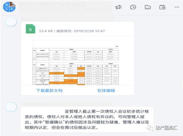 前期準(zhǔn)備工作完成,管理人可將會議資料上傳至釘釘群文件,所有債權(quán)人均可下載查閱會議流程及會議內(nèi)容。
