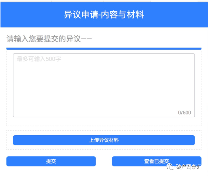 對債權(quán)表中記載的自己債權(quán)或他人債權(quán)有異議的,債權(quán)人可向管理人提出異議,債權(quán)人可點(diǎn)擊異議鏈接提交異議原因并上傳相關(guān)資料,當(dāng)前異議鏈接僅支持輸入異議原因并上傳相關(guān)資料,不能前置選擇是否存在異議,建議未來可對此加以完善,對異議鏈接可以設(shè)置前置選擇程序,對自己債權(quán)是否存在異議,如果存在則說明原因并上傳相關(guān)資料,對他人債權(quán)是否存在異議同理。