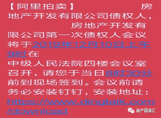 若債權(quán)申報已經(jīng)結(jié)束,可將制作的包含債權(quán)人、代理人姓名、身份證號、聯(lián)系電話的債權(quán)申報表導(dǎo)入釘釘后臺,通過釘釘后臺給債權(quán)人或代理人群發(fā)邀請鏈接的方式邀請其加入債權(quán)人組織。此種方式的優(yōu)點(diǎn)為:群發(fā)短信方便快捷,缺點(diǎn)為:釘釘?shù)亩绦叛堟溄訕?biāo)準(zhǔn)模板只能包含30個字符,由于字?jǐn)?shù)限制短信不能向債權(quán)人說明詳細(xì)內(nèi)容,會遺漏重要信息,如果自定義短信模板則需要審核,時間至少需要1-2天。同時,由于通知短信為阿里釘釘平臺發(fā)送,可能被部分手機(jī)誤認(rèn)為垃圾短信攔截,根據(jù)《企業(yè)破產(chǎn)法》第六十三條規(guī)定,召開債權(quán)人會議,管理人應(yīng)當(dāng)提前十五日通知已知的債權(quán)人。因此建議管理人最好預(yù)留足夠的時間做好通知工作,以確保程序合法。