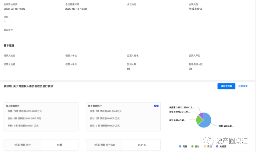 實務(wù)中線下債權(quán)人會議簽到也動輒需要一個小時,經(jīng)常是通知九點(diǎn)鐘開會,實際上簽到結(jié)束后九點(diǎn)半甚至十點(diǎn)才能開會;在統(tǒng)計表決票時更覺緊張,需要在短時間內(nèi)進(jìn)行唱票和計票完畢,并統(tǒng)計出結(jié)果。本次債權(quán)人會議相比省時省力許多, 14:00準(zhǔn)時開會,15:00開會完畢,法官宣布投票之后,短短的5分鐘之內(nèi)便統(tǒng)計出線上和線下的合計投票結(jié)果,高效便捷。