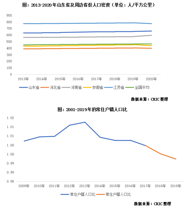 2020年山東省常住人口規(guī)模達(dá)到10152.7萬(wàn)人,常住人口規(guī)模排全國(guó)第二。與2010年第六次人口普查的9579.3萬(wàn)人相比,十年共增加573.4萬(wàn)人,增長(zhǎng)5.99%,年平均增長(zhǎng)率為0.58%。十年來山東人口增量位列全國(guó)第四,繼續(xù)保持平穩(wěn)增長(zhǎng)態(tài)勢(shì)。人口密度來看,2020年山東省人口密度為660人/平方公里,剔除上海、北京和天津三個(gè)直轄市,僅次于廣東和江蘇兩省。從常住戶籍人口比來看,雖然山東省常住人口持續(xù)增長(zhǎng),但從2018年開始常住戶籍人口比降至1以下,呈現(xiàn)出人口流出態(tài)勢(shì)。