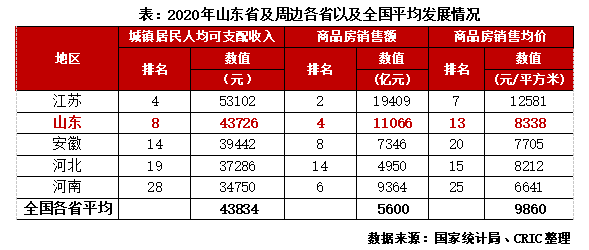 人口支撐購(gòu)房需求,居民購(gòu)買力催生購(gòu)買意愿。山東省作為人口大省,商品房市場(chǎng)購(gòu)房需求大,2020年全省商品房銷售總額約1.11萬(wàn)億元,占全國(guó)商品房銷售額的6.4%,排名第四。城鎮(zhèn)居民人均可支配收入為43726元,略低于全國(guó)平均,但高于周邊除江蘇外的其他省份。就居民購(gòu)買力來看,商品房均價(jià)可承受度高,一定程度上能加強(qiáng)居民購(gòu)買意愿,促進(jìn)房地產(chǎn)市場(chǎng)進(jìn)一步發(fā)展。