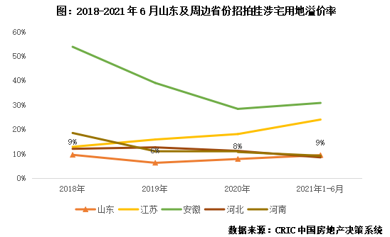 溢價(jià)率低于周邊省份,土拍市場(chǎng)相對(duì)平靜。據(jù)CRIC監(jiān)測(cè),2018至2021年6月,山東省涉宅招拍掛用地的溢價(jià)率維持在6%-9%之間,與周邊省份相比,處于較為健康水平。2021年,在雙集中供地新政下,濟(jì)南和青島兩市在5月完成了首批集中供地的出讓,市場(chǎng)熱度較低,分別有63%和98%的土地以底價(jià)出讓,其中青島的平均溢價(jià)率僅2%。