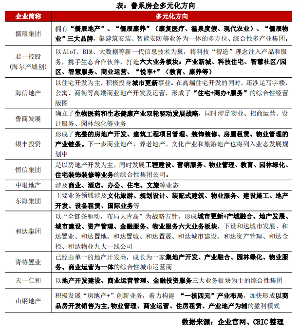 12家企業(yè)明確多元化方向,涉及范圍廣。從17家重點(diǎn)監(jiān)測(cè)的魯系房企來看,共有12家明確了多元戰(zhàn)略,其中多數(shù)本身為企業(yè)集團(tuán),地產(chǎn)部分只是集團(tuán)多元化板塊之一。比如,除地產(chǎn)開發(fā)外,儒辰集團(tuán)還擁有康養(yǎng)、物業(yè)兩大板塊,此外還有建筑安裝和智能安防等綜合業(yè)務(wù)。君一控股(海爾產(chǎn)城創(chuàng))、魯商發(fā)展、銀豐投資、恒信集團(tuán)等作為企業(yè)集團(tuán),也至少擁有3個(gè)多元業(yè)務(wù)方向,值得一提的是,為完善地產(chǎn)開發(fā)上下游產(chǎn)業(yè)鏈,多數(shù)企業(yè)涉及了物業(yè)管理、裝飾設(shè)計(jì)等“地產(chǎn)+”業(yè)務(wù)。然而,也有房企涉足的部分多元業(yè)務(wù)與地產(chǎn)開發(fā)領(lǐng)域關(guān)系不大,比如魯商發(fā)展涉及化妝品和藥品生產(chǎn)銷售、恒信集團(tuán)發(fā)展教育業(yè)務(wù)、和達(dá)集團(tuán)把資產(chǎn)管理和金融服務(wù)納入主要業(yè)務(wù)板塊。