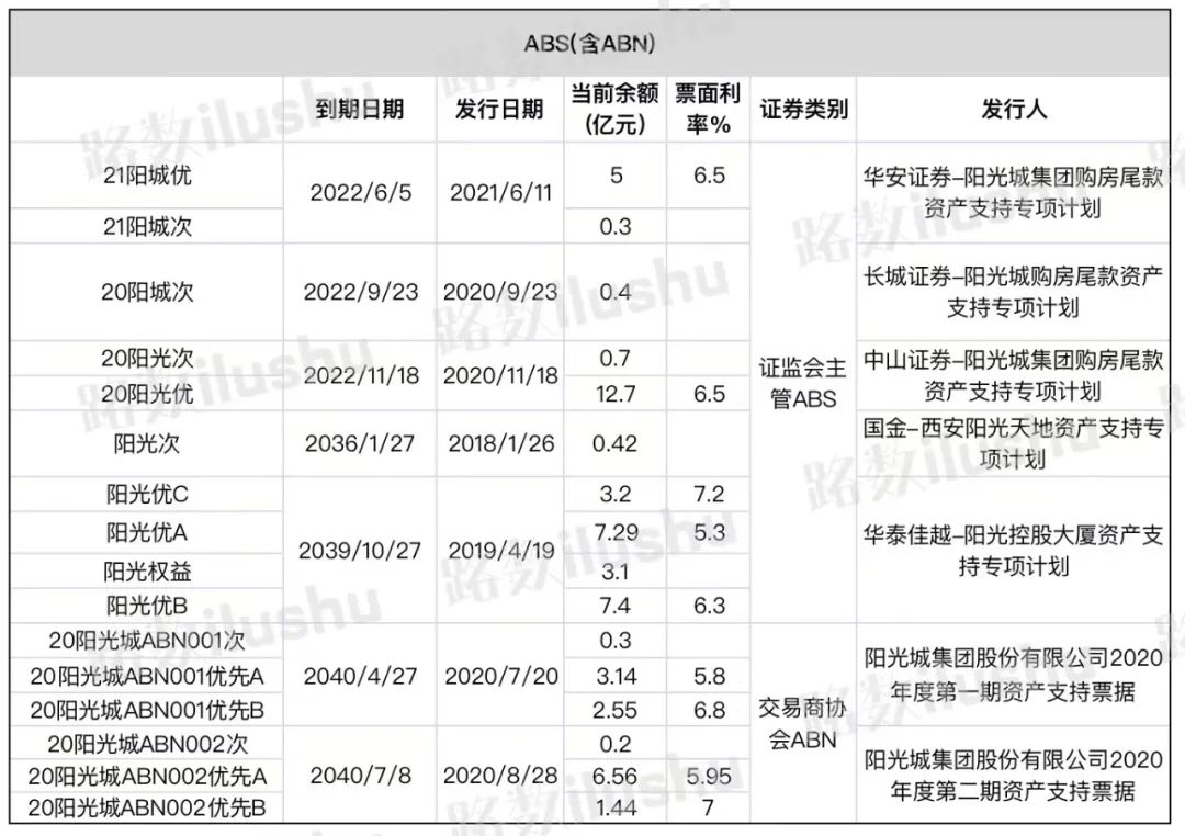 其中有:一只由“中山證券-陽光城集團購房尾款資產支持專項計劃”發起的ABS產品“20陽光優”,回售到期。一筆為美元債“陽光城10% N20230212“,也是回售到期。另外還有一筆境內債“18陽光04”和一筆供應鏈。
