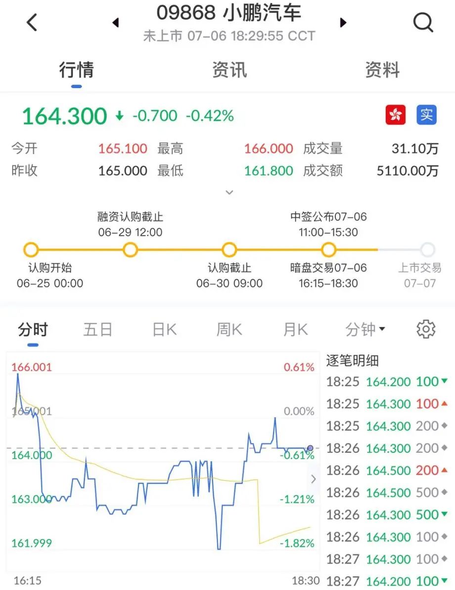 小鵬汽車將于7月7日在港交所掛牌上市,發(fā)行價(jià)為每股165港元,股票代碼9868。7月6日,小鵬汽車暗盤開漲后,跌破發(fā)行價(jià),最低價(jià)達(dá)162港元,暗盤收盤價(jià)為164.3港元。