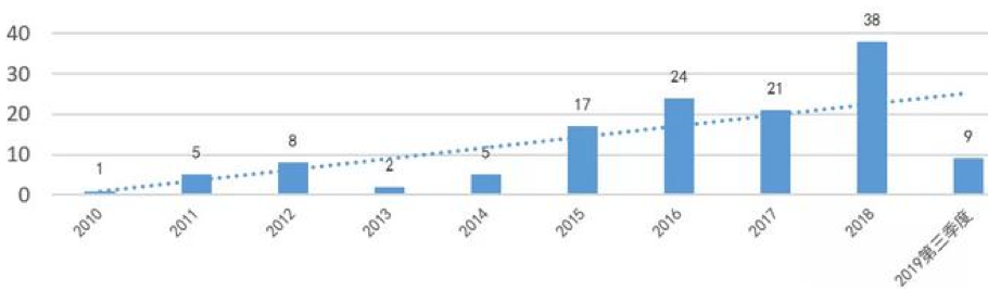 2010年至2019年第三季度,證監會及其派出機構總計對130件操縱市場案件作出行政處罰,占十年間證監會行政處罰案件總數的近十分之一。證監會處罰的操縱市場案件的數量僅次于內幕交易、虛假信息披露案件,是監管部門重點關注的三大資本市場違規行為之一。2015年以后,證監會對操縱市場案件的查處力度明顯加強,2015年至2019年第三季度,證監會總計對109件操縱市場案件作出行政處罰,平均每年處罰操縱市場案件約21件,是2015年以前操縱案件年平均處罰數量的5倍,其中2018年處罰的操縱市場案件數量最多,達到38件。具體如下圖所示: