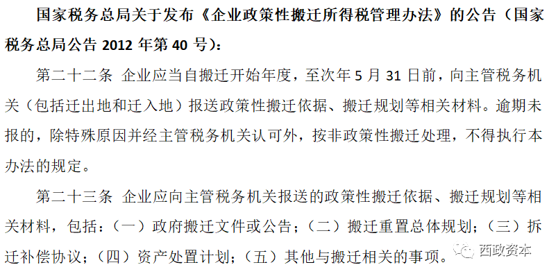 2. 政策性搬遷所涉遞延納稅的優(yōu)惠政策須以申報(bào)、備案為前提,如被拆遷企業(yè)未及時(shí)申報(bào)、備案,則不能自然享受遞延納稅的優(yōu)惠政策,也即遞延納稅事宜如未及時(shí)申報(bào)、報(bào)備或未及時(shí)完稅,則面臨滯納金、罰金等繳納風(fēng)險(xiǎn)。