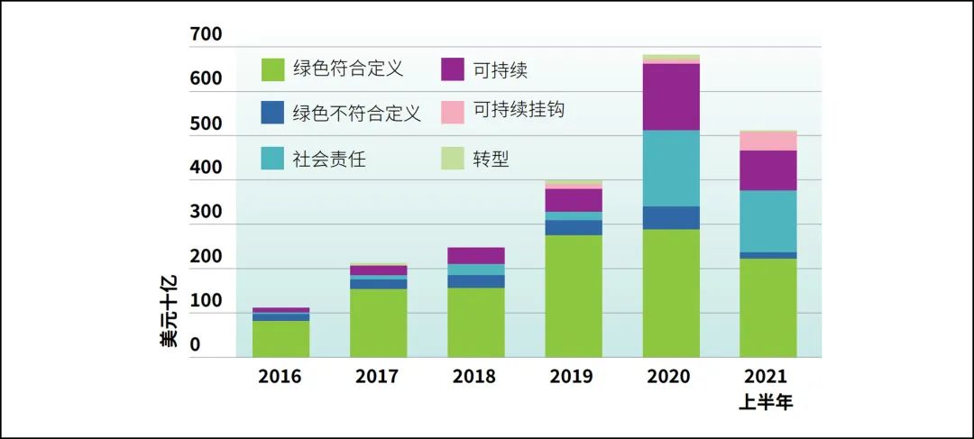 截至2021年上半年,全球可持續債券市場——包括綠色、社會和可持續發展債券、可持續掛鉤債券和轉型債券——的發行量達到4,961億美元,同比增長59%。