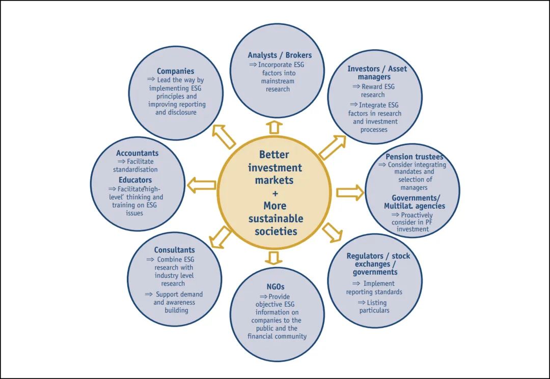 從2004年至2008年,倡議支持者們每年都會舉辦一場會議,并發布年度研究報告。為提高各自角色的清晰度,支持者們針對不同類型的市場參與者,提出了相應的ESG工作建議。