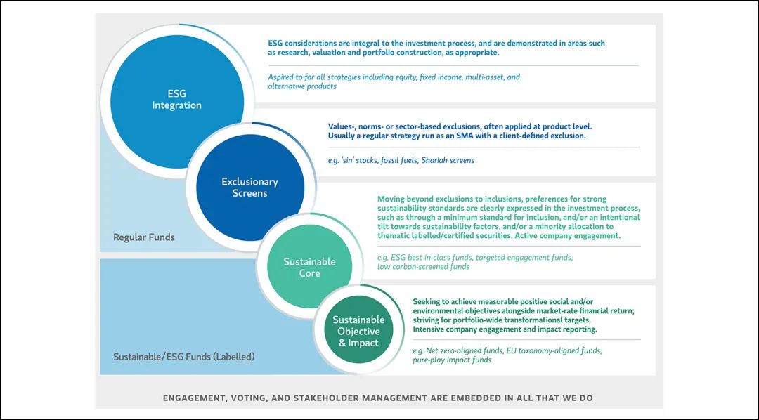 此外,摩根士丹利還建立了一套ESG投資框架。該框架主要由四個部分組成,通過ESG整合及ESG剔除,將不合格的投資標的從資產中剔除;更進一步,通過對領先ESG企業的識別,建立主動型的ESG投資產品。