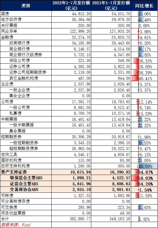 2022年1-7月份,我國資產證券化產品發行規模為10676億元,同步增長-34.87%。其中銀保監會主管ABS發行規模為1898億元,同比增長-58.03%;證監會主管ABS發行規模為5842億元,同比增長-34.26%;交易商協會ABN發行規模為2936億元,同比增長-1.54%。