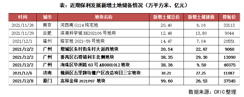 值得注意的是,近期保利發展在土拍市場上依舊積極。12月2日,廣州第三批集中供地共推出17宗地,其中保利接連獲取3幅地塊,包括38.36億獲取的珠華洲路63號地塊,38.35億獲取的番禺石樓鎮利豐北地塊,以及20.54億獲取的增城朱村地塊,成交總價97.2億元,接近百億。而此后,濟南、廈門的第三批集中供地中,保利也均有布局,在廈門更是聯合了國貿、聯發以99.6億的價格獲取了高林金林片區地塊。據不完全統計,保利發展在第三輪土拍市場上獲取的土地權益前總金額已經達274億元。