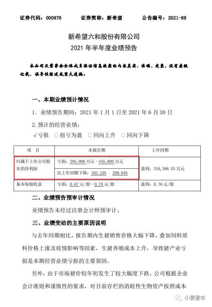 7月15日,新希望(000876.SZ)公告稱,上半年預計經營業績為虧損,報告期內歸屬于上市公司股東的凈利潤預虧29.5億-34.5億元,比上年同期下降193.24%- 209.04%。